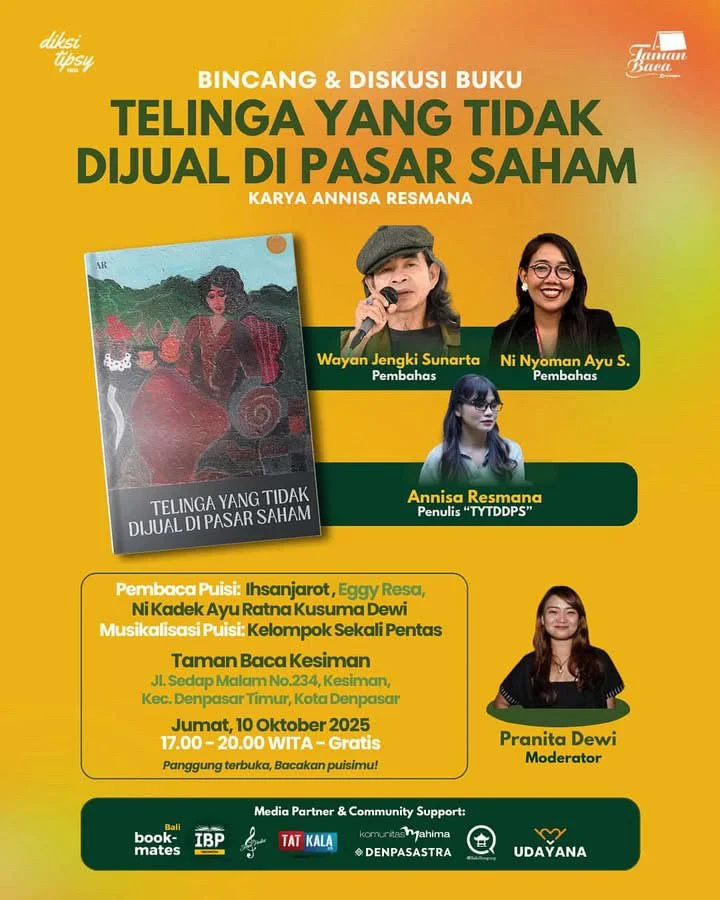 Telinga yang Tidak Dijual di Pasar Saham (TYTDDPS) akan dibicarakan dalam bincang dan diskusi buku pada Jumat, 10 Oktober besok di Taman Baca Kesiman, Denpasar, Bali.